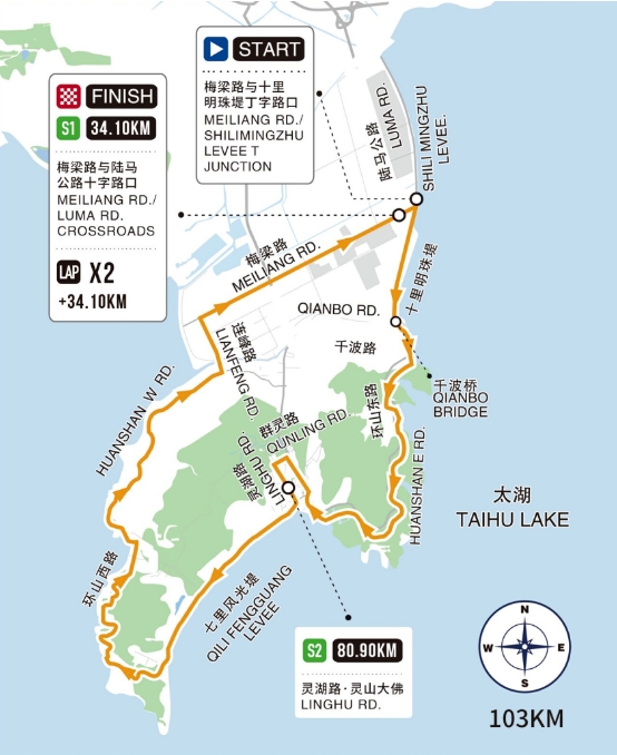 无锡,这座镶嵌在太湖之滨的璀璨明珠,自古便是江南水乡的代表。这里山清水秀,文化底蕴深厚,是现代都市与自然风光的完美融合体。太湖的浩渺烟波、古运河的悠悠水韵,以及那些散落在城市各处的古典园林与名胜古迹,共同编织出一幅幅动人的画卷。自2010年首届环太湖赛成功举办至今,无锡一直是赛事的起始之站。跟往年不同的是,今年的首赛段全部安排在无锡滨湖马山,全长103公里,起点设立在梅梁路与十里明珠堤的丁字路口,具体走向为梅梁路与十里明珠堤丁字路口→十里明珠堤→千波桥→环山东路→群灵路→灵湖路→七里风光堤→环山西路→连峰路→梅梁路与陆马公路十字路口。两个冲刺点分别设在34.10公里梅梁路与陆马公路十字路口和80.90公里灵湖路·灵山大佛处,不仅考验车手们的爆发力,也为赛事增添了更多看点。