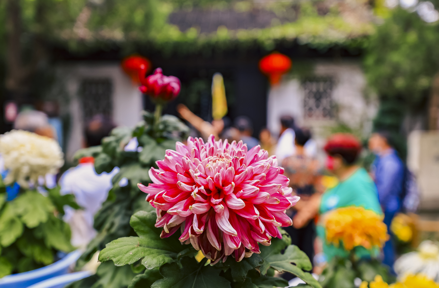 虽未到深秋,已可见盆栽秋菊绽放的模样。古迹区中轴线上,大家的脚步放得更慢了,无他,赏菊打卡。珍稀的菊花品种,连线成片,缤纷的花朵或矜持不动,或摇曳生姿,与游人合影留念,记住整个假期和秋天。待到10月底的全国菊展,惠山古镇更将有一番香漫金秋、 千姿百态的迷人景象!