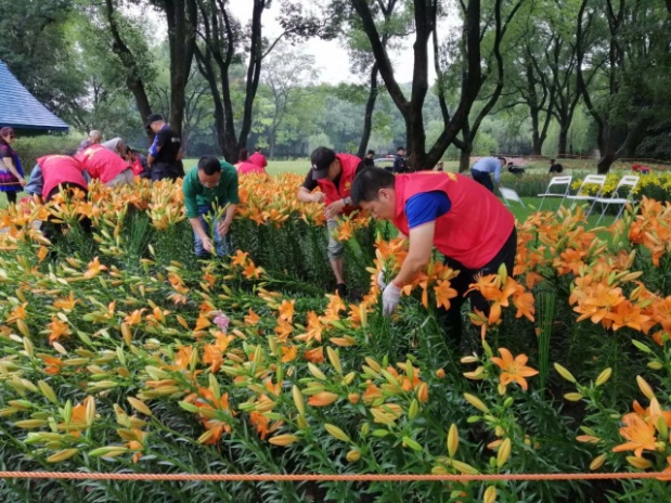 10月3日晚上的一场大雨让景区内的百合花出现了大面积的倒伏情况。为保证景观质量,管理处立即寻求解决方法,利用竹签和铁丝对倒伏的百合花枝进行固定,不仅小巧有利于操作,还隐形美观。各科室、班组齐心协力,这一片由票务客服中心“承包”,那一片交给安保部门,那里交给园艺部门,这里由管理处各科室负责。一朵朵倾倒的百合在大家的努力下,绽放着更美的姿态。比百合花更美的,则是这些“护花使者”们!弯腰、蹲下、马步......都是累人的姿势,没有人喊累,看着百合花“重获新生”,更加感觉不到累。