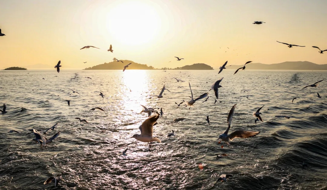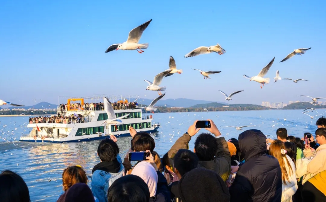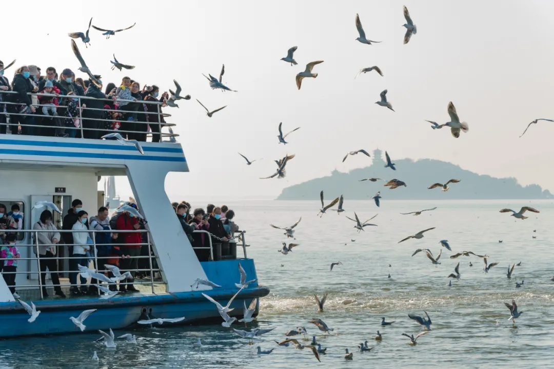在鼋头渚,红嘴鸥与游人之间形成了一种独特的默契。游人们投喂食物时,红嘴鸥会优雅地俯冲而下,精准地接住抛向空中的食物。它们并不惧怕人类,反而展现出一种亲近的姿态。这种互动,展现了生命之间最纯粹的信任与善意。