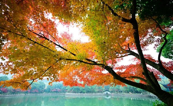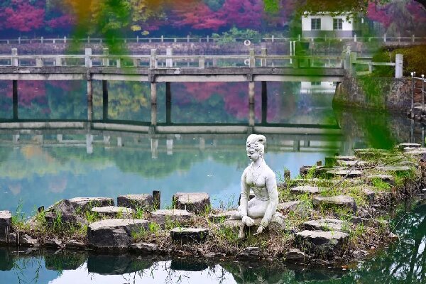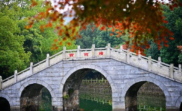 02.冬日探“友”。 古有岁寒三友 ,在旺山,也有“三友”。西施、西施桥与这碧绿的池水,踏在久别重逢的途中,被“旺山三友”家中的美景所惊叹,好似明白杜牧为什么,要“停车”看那“枫林晚”,毕竟“霜叶红于二月花”。行走在这里,冬天的寒意也来得迟些,来好友家做客,无需带些什么,不如放下一身疲倦,静静听听西施诉说着爱情中的缱绻和西施桥谈古论今,坐在像是沉稳大哥般的池水旁,欣赏着旺山那寂静而细腻的美感。接下来,随着温度的降低,旺山的银杏与红枫,将进入最佳观赏期,如同打翻了自然调色盘,逐渐染上棕色、翠黄等“美拉德”配色。周末不妨去旺山走走,携伴而行,赏一路“枫”景,旺山三友总是喜欢热闹的。在西施塘附近,树树冬声,叶叶皆景,枫叶和银杏叶鲜艳交错,丹枫成林,湖清如镜。