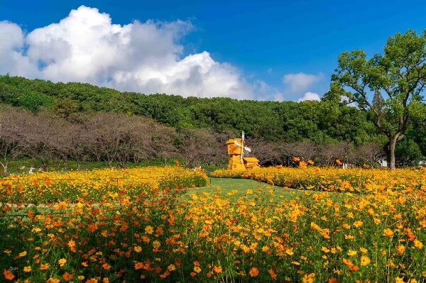 二是聚焦花卉景观,高水平打造精致化景观节点。国庆期间,植物园打造了总面积逾万平方米的壮丽花海。硫华菊温暖灿烂,马鞭草浪漫迷离,粉黛乱子草轻柔似梦,再辅以火焰鸡冠花、向日葵与千日红等,共同编织出一幅斑斓的秋日画卷。不仅如此,在公园主入口、核心花坛及旱溪等关键节点,更通过打造多个精致的花境景观,将时令花卉巧妙组合,形成一系列色彩浓烈、层次丰富的精致景观,极大地烘托出喜庆、祥和的节日氛围,为游客献上一场视觉的盛宴。