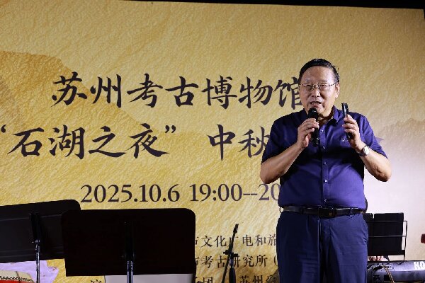10月6日中秋之夜,苏州考古博物馆首次开放夜场。石湖之畔,行春桥的九孔映着银辉,考古博物馆广场上,“来点艺术”系列活动之苏州考古博物馆“石湖之夜”中秋音乐会拉开帷幕。千年文物与现代旋律在此交织,而最令人惊喜的,是中国社会科学院学部委员王巍院士的亲临献唱,为这场文化盛宴注入了独特的学术温度与人文情怀。