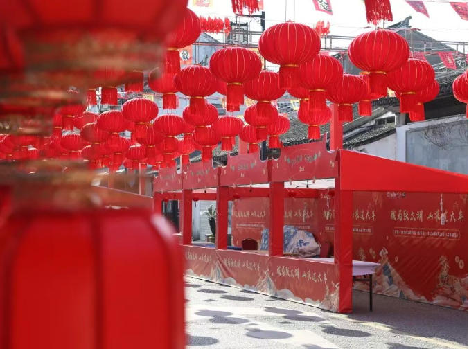 东山西街“骏马跃太湖 山浪过大年”新春活动,正缓缓拉开序幕,沿街的装饰也换上了新春盛装。