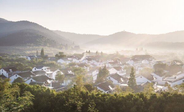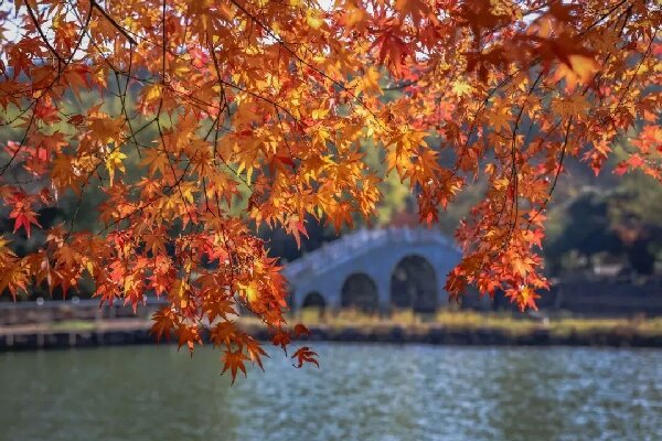 从叆叇岭入口沿石阶而上,森林中木质清香混合泥土气息,令人心旷神怡。徒步约2小时抵达山顶乾元寺,远处的太湖若隐若现,九龙潭如翡翠镶嵌在山腰,西施塘枫叶正红,宛如系在山间的红丝巾。俯瞰钱家坞,白墙黛瓦藏在茶竹深处,江南田园风光尽收眼底。