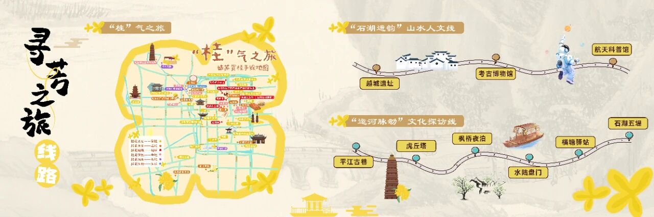 其中,“桂气之旅”推出姑苏赏桂手绘地图,让游客能循香而行,感受秋日美好;“石湖遗韵”山水人文线从越城遗址延伸至考古博物馆、航天科普馆,实现历史文脉与科技创新的精彩对话;“运河脉动”文化探访线则串联平江古巷、虎丘塔、枫桥等标志性景点,再现大运河文化带的千年脉络。