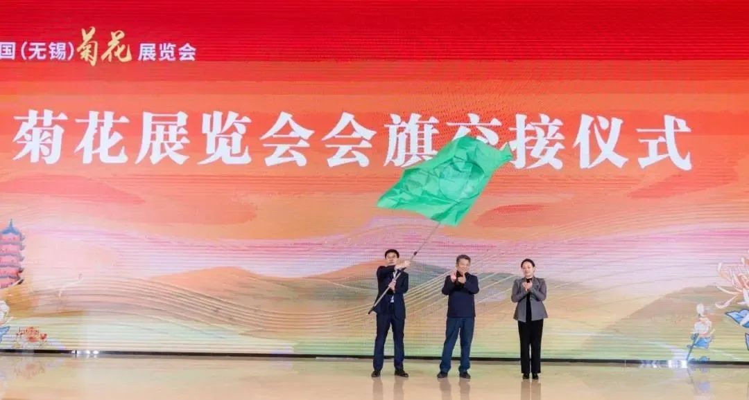 无锡市人民政府副市长卢敏、中国风景园林学会菊花分会会长祝玮、开封市人民政府副市长袁钢一同上台,进行了会旗交接仪式,开封市人民政府正式成为第十五届中国菊花展览会的主办单位。