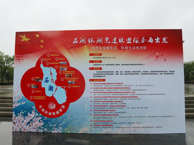 本次主题党日不仅是一次集中学习,还融合了“石湖环湖党建联盟服务再出发”志愿服务活动。活动分为三个板块。在第一板块“绘制联盟服务热力图”中,通过30多块展板回顾了石湖环湖党建联盟2019年3月成立以来,各单位的工作成果与风采。在第二板块“目标再攀高,跑出石湖建设发展加速度”中,以“回眸”与“展望”两大视角,重点展示了上方山森林动物世界2016年开园时的图片资料,正在平稳推进中的市植物园(上方山)建设项目导览与介绍,以及南石湖越来溪综合体项目鸟瞰图、效果图。在第三板块“科普点亮新生活,你我生活更美好”中,来自联盟各单位的志愿者在现场为市民提供便民惠民服务。现场还设置了补鞋、修伞、磨刀等便民摊位,为游客居民提供贴心服务,倡导节约环保的生活消费理念。